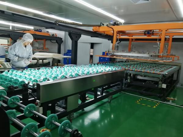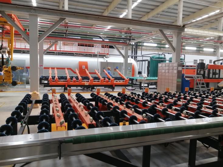 主要由自動上片臺、清洗干燥機、合片定位輸送機、自動行走吸盤吊架、PVB 膠膜鋪攤機、合片房、預壓機、下片臺、蒸壓釜等組成。